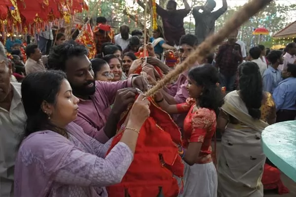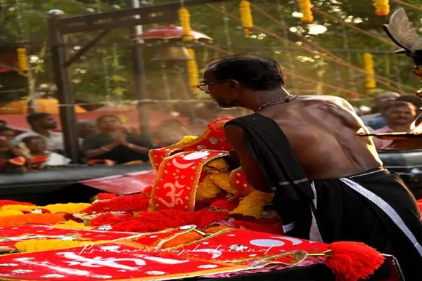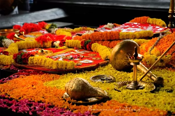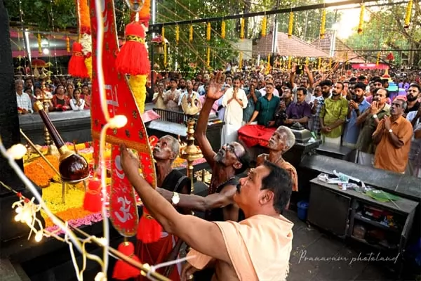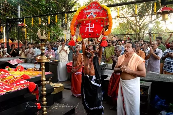04The centuries old dravidian folk art by name " Bharatham kali( ഭാരതം കളി ), Malakkuda procession( മലക്കുട എഴുന്നള്ളത്ത് ), and Kettukazhcha ( കെട്ടുകാഴ്ച ) are the main traditional functions at the temple on the Utcharam day of Makaram 28.