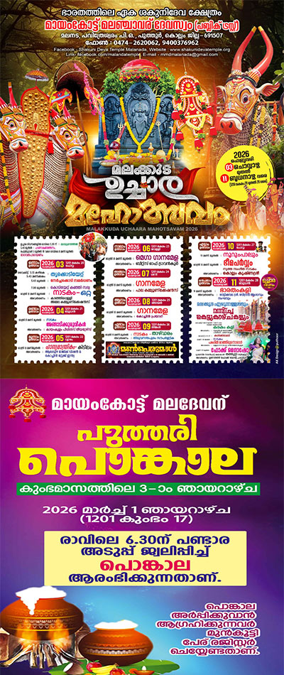 The temple festival known by name " Malakkuda Utchara Maholsavam" celebrates to 9 days, starts by hoisting of flag on Makaram 20 and ends at Makaram 28 every year.