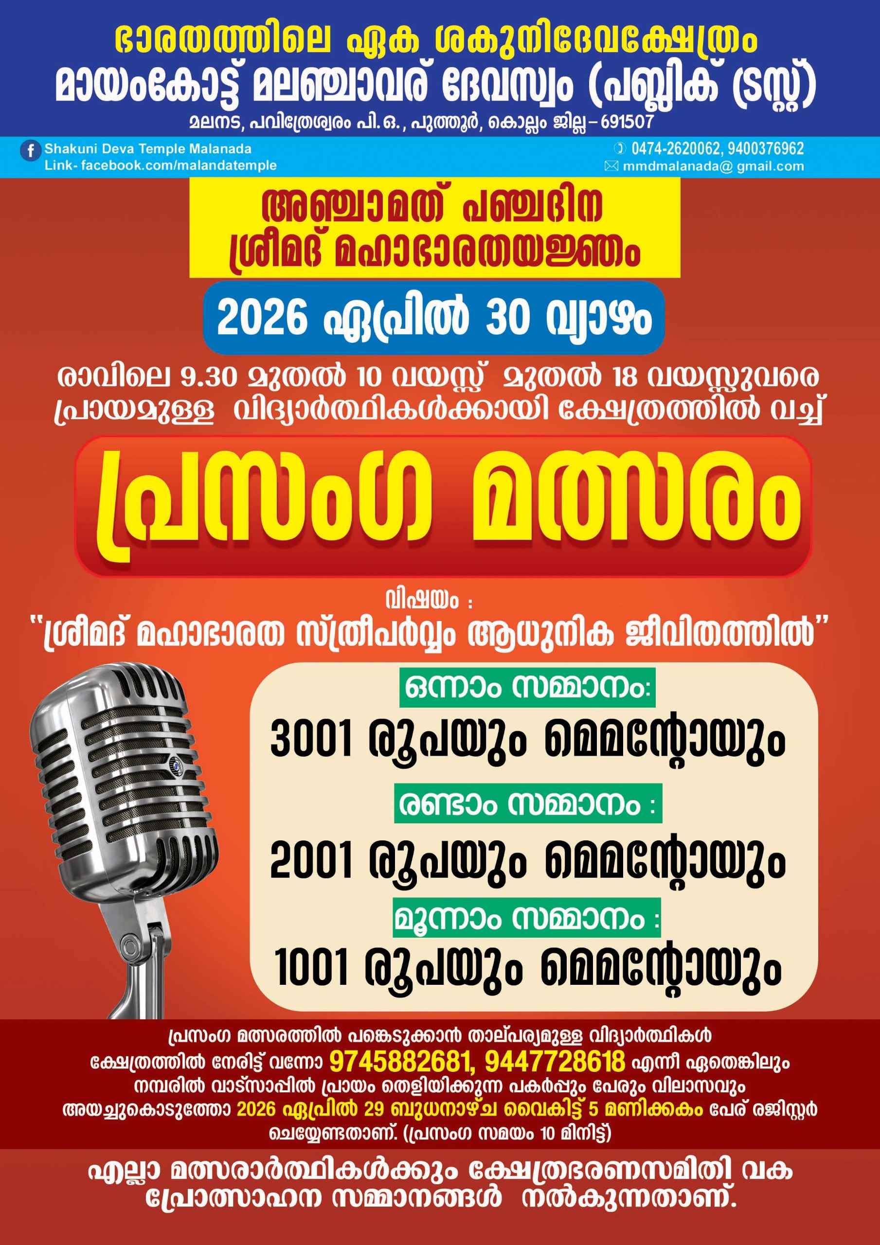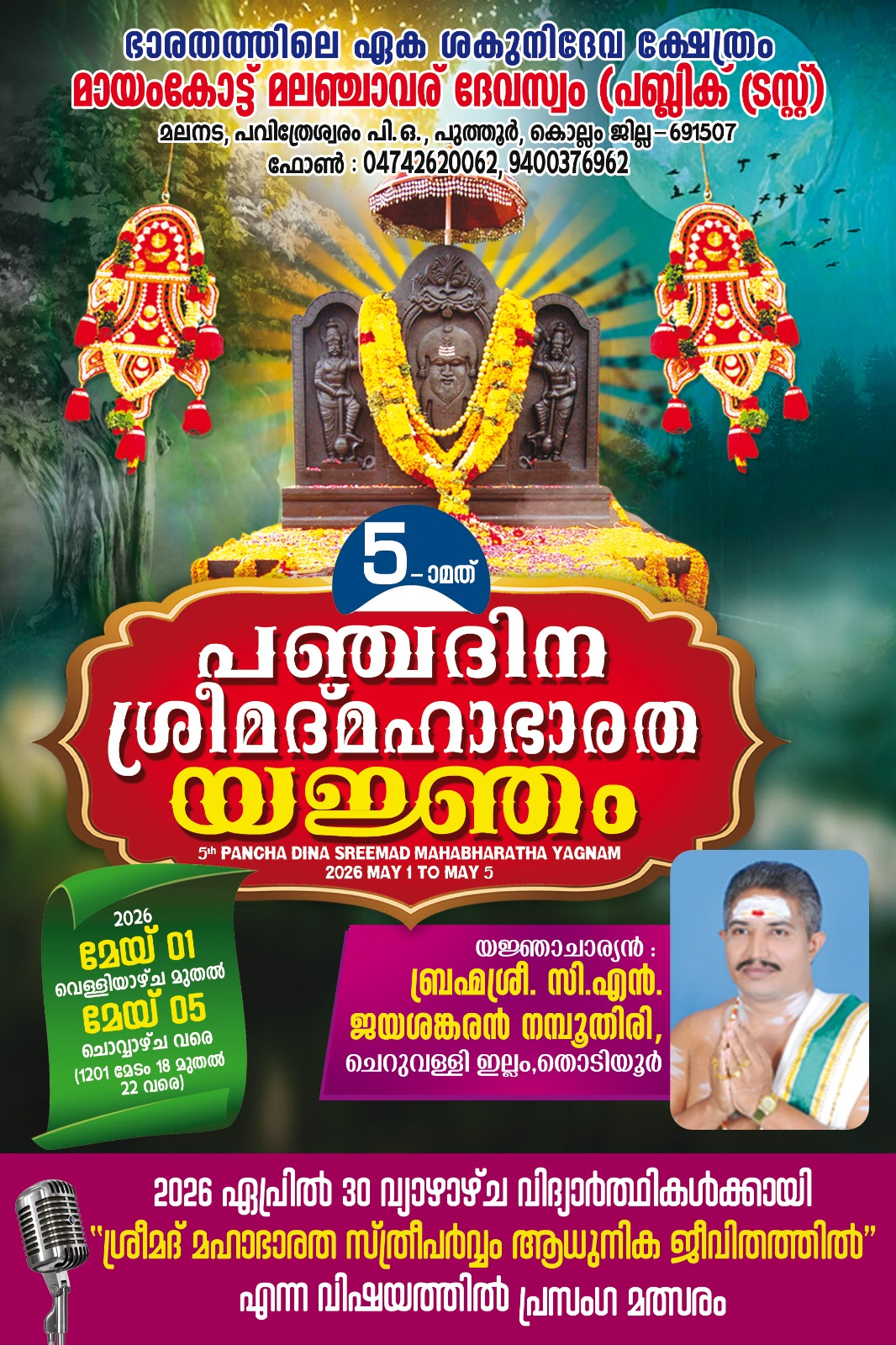 This is the unique temple having the recitation of Sreemad Mahabharatham for the last more than 75 years. Now on every first saturday of Malayalam month and having a Mahabharatha Yagnam for five days during the month of April- May every year.